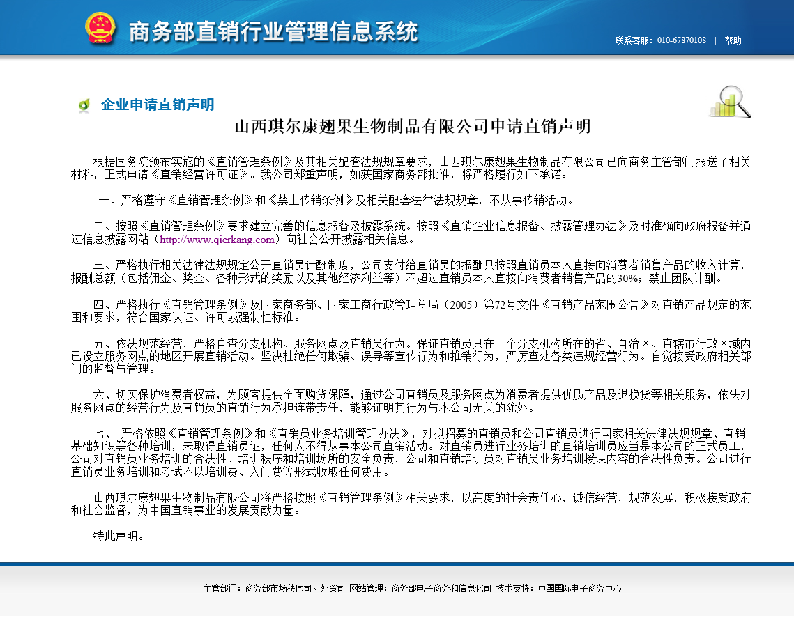 山西琪爾康翅果生物制品有限公司申請直銷聲明
